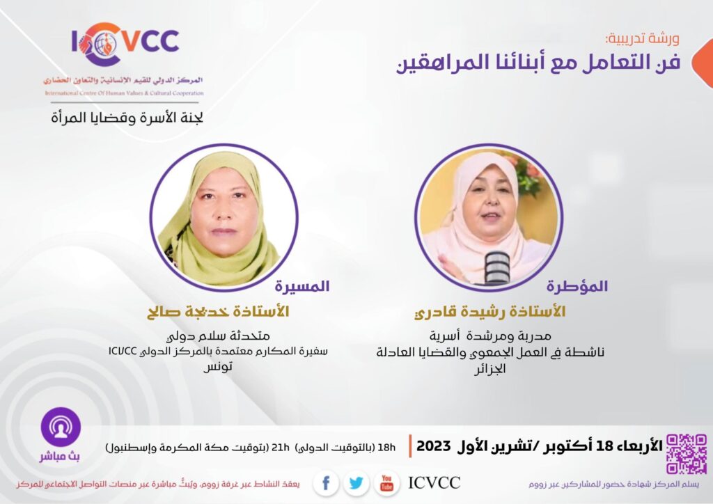 تنظم #لجنة_الأسرة_وقضايا_المرأة ب #للمركز_الدولي_للقيم_الإنسانية_والتعاون_الحضاري ورشة في موضوع: فن التعامل مع المراهقين مع الأستاذة : رشيدة قادري مدربة ومستشارة أسرية / الجزائر يدير اللقاء الأستاذة : خديجة صالح متحدثة سلام دولي /تونس الموعد: الأربعاء 18 أكتوبر/ تشرين الأول 2023 السادسة مساء بالتوقيت الدولي السابعة مساء بتوقيت الجزائر المغرب التاسعة مساء بتوقيت مكة المكرمة رابط الغرفة المباشر: […]